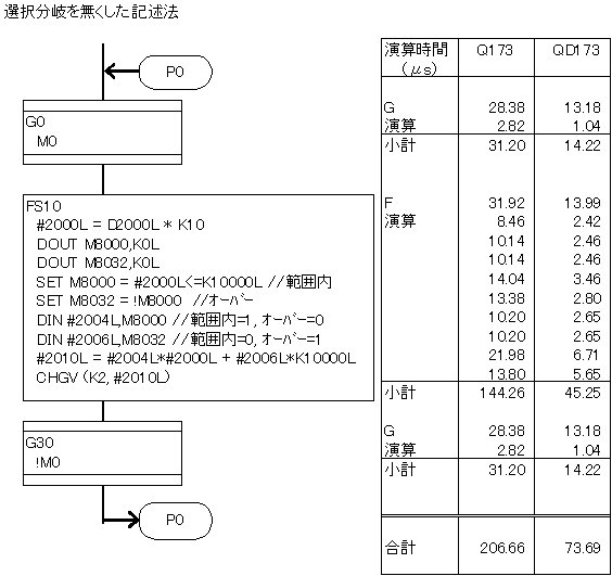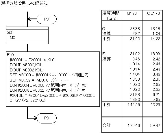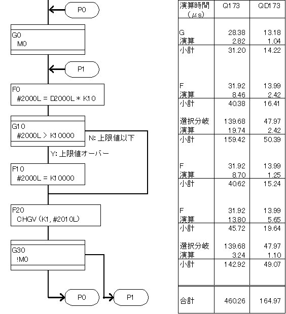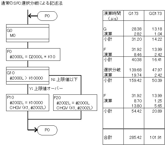 SFC演算時間のうち、数値演算の部分が多いかと思えば実はそれほどでもなくて、SFCの図の移行や選択分岐・並列分岐/結合 などが結構な負担になっています。 イベントタスクで処理する場合など、SFC図の描き方次第で、設定周期で回りきれないソフトになてしまうことも、しばしばあります。