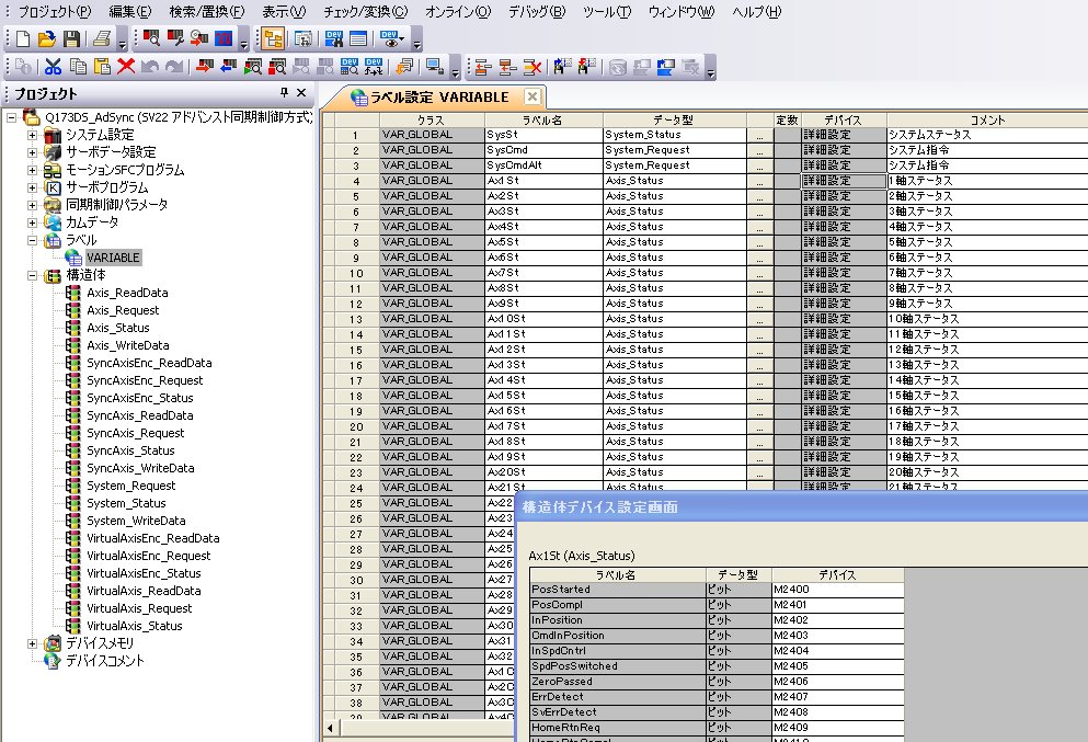 - アドバンスト同期制御はかなり多くのシステムデバイスが予め割り当てられており、10000番代でなおかつ先頭番号の10番代が途中から始まるため、ほとんど覚えられない、間違いを起こしやすい状態です。 ラベル機能を使うことで、間違いをかなり減らせる可能性があります。